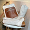 Este set está compuesto por una bota y un bolso confeccionados en cuero vacuno natural, con base en tono África blanco y detalles en coñac. Ambos diseños reflejan el trabajo artesanal uruguayo, con terminaciones cuidadas, texturas marcadas y una armonía cromática que eleva cualquier look.