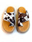 Esta sandalia slide, confeccionada artesanalmente en cuero vacuno natural con pelo, se presenta en un impactante diseño vaca con pelo marrón. La base acolchada y las tiras anchas aportan confort inmediato, mientras que el patrón del cuero convierte a cada par en una pieza única e irrepetible.