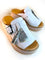 Confeccionada artesanalmente encuero vacuno natural, este modelo en color blanco combina una base neutra con detalles en textura metálica y una hebilla lateral que le da carácter. Su plataforma liviana y su interior forrado garantizan confort para usar todo el día sin esfuerzo.